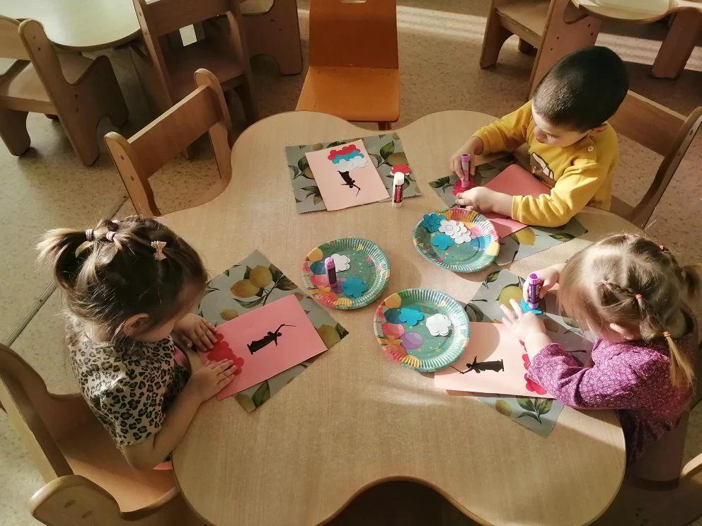 · В ясельной группе малыши впервые познакомились с темой подвига через музыку и творчество. Они слушали песни «Идут ветераны» и «На Мамаевом кургане тишина», а затем сделали аппликацию «Родина-мать», символизирующую мир и память.